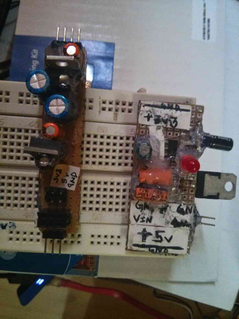 I try to make many of them as they are really important for my breadboard projects. The first prototype I made was a breadboard plug-on power supply unit. Powered by 7v/3000mAH power supply unit. Later I made a smaller Power Supply Unit(PSU). Both of them have Linear regulators from TI, filter cap and protection diodes for reverse polarity. Currently there isn't any short circuit protection, but I have plans to add that in my next prototype.